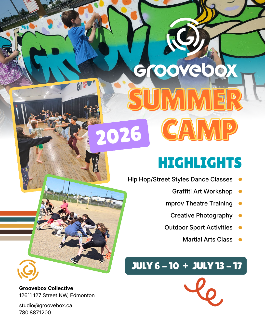 Get a deep dive into the street dance styles, martial arts self defence, fitness, digital media, improv and tons of games and contests! We are excited to provide this top notch training and performance opportunity.